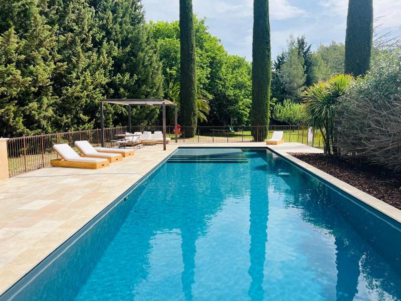 Espaces Modernes réalise votre terrasse en pierre naturelle autour de votre piscine béton à Puyricard, ajoutant un cachet authentique et une durabilité inégalée.